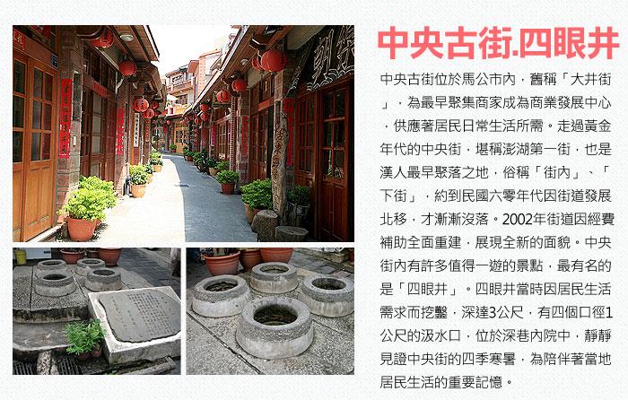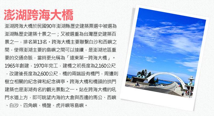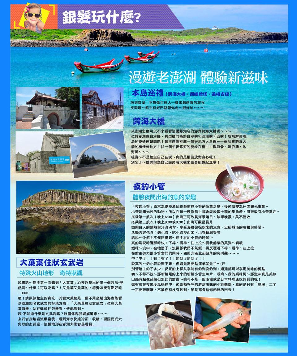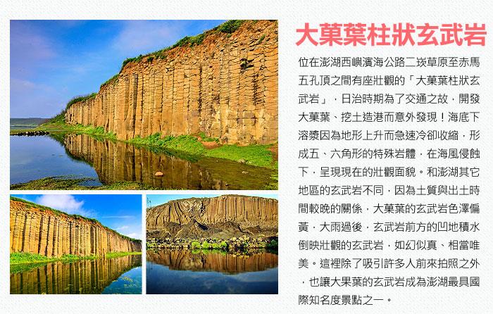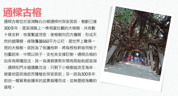 【第2天】西嶼線環島采風(通樑古榕、跨海大橋、二崁古厝、大菓葉玄武岩)/赤崁漁產觀光商圈/境內免稅商店/市區古街鬧區漫遊(天后宮、中央古街、四眼井、個性商店巡禮)/澎湖土特產試吃品嚐 ◆《澎湖景點遊覽》通樑古榕、跨海大橋、二崁古厝、玄武岩。 | ||||